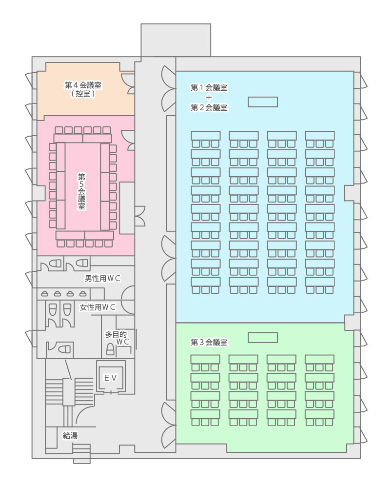■第1+第2会議室:最大108名 ■第1会議室:最大48名 ■第2会議室:最大48名 ■第3会議室:最大48名 ■第4会議室:最大6名 ■第5会議室:最大30名 |